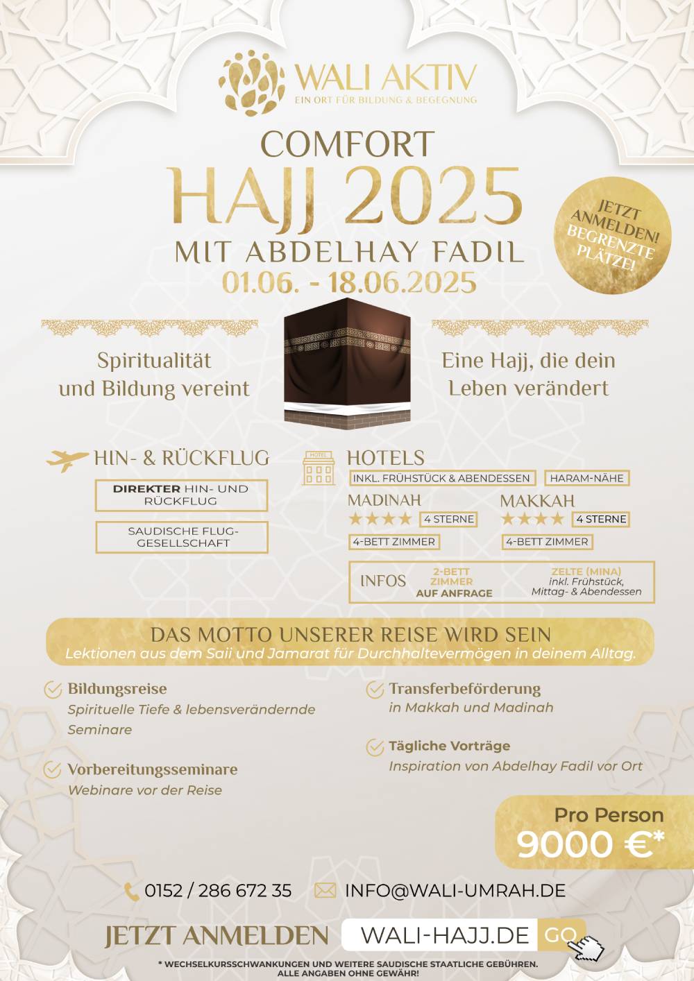 Begleitet von Abdelhay Fadil und einem erfahrenen Team, helfen wir dir, die spirituellen und lebensverändernden Aspekte der Hajj zu verstehen, zu verinnerlichen und praktisch anzuwenden.